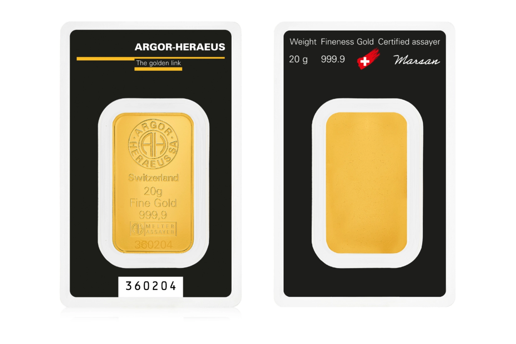 Our minted bars are the result of cutting-edge Swiss technology, refined craftsmanship and strict quality control. Each bar is sealed together with its assay card, a credit card–sized certificate of authenticity, in a transparent blister pack that ensures protection.
