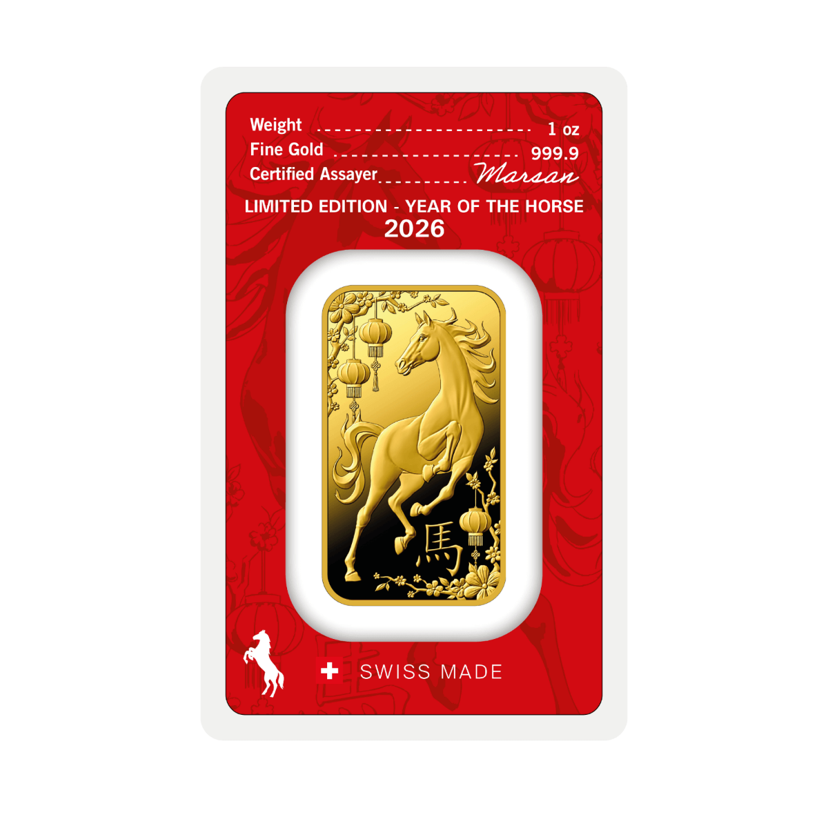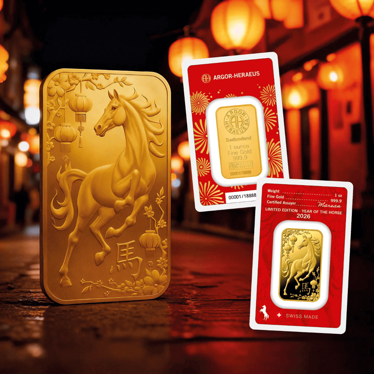 Gold reflects the same qualities: enduring strength, brilliance, and the will to shine across generations. The Year of the Fire Horse Gold Bar by Argor-Heraeus brings these qualities to life, featuring a majestic horse in motion surrounded by motifs that symbolize celebration and renewal.