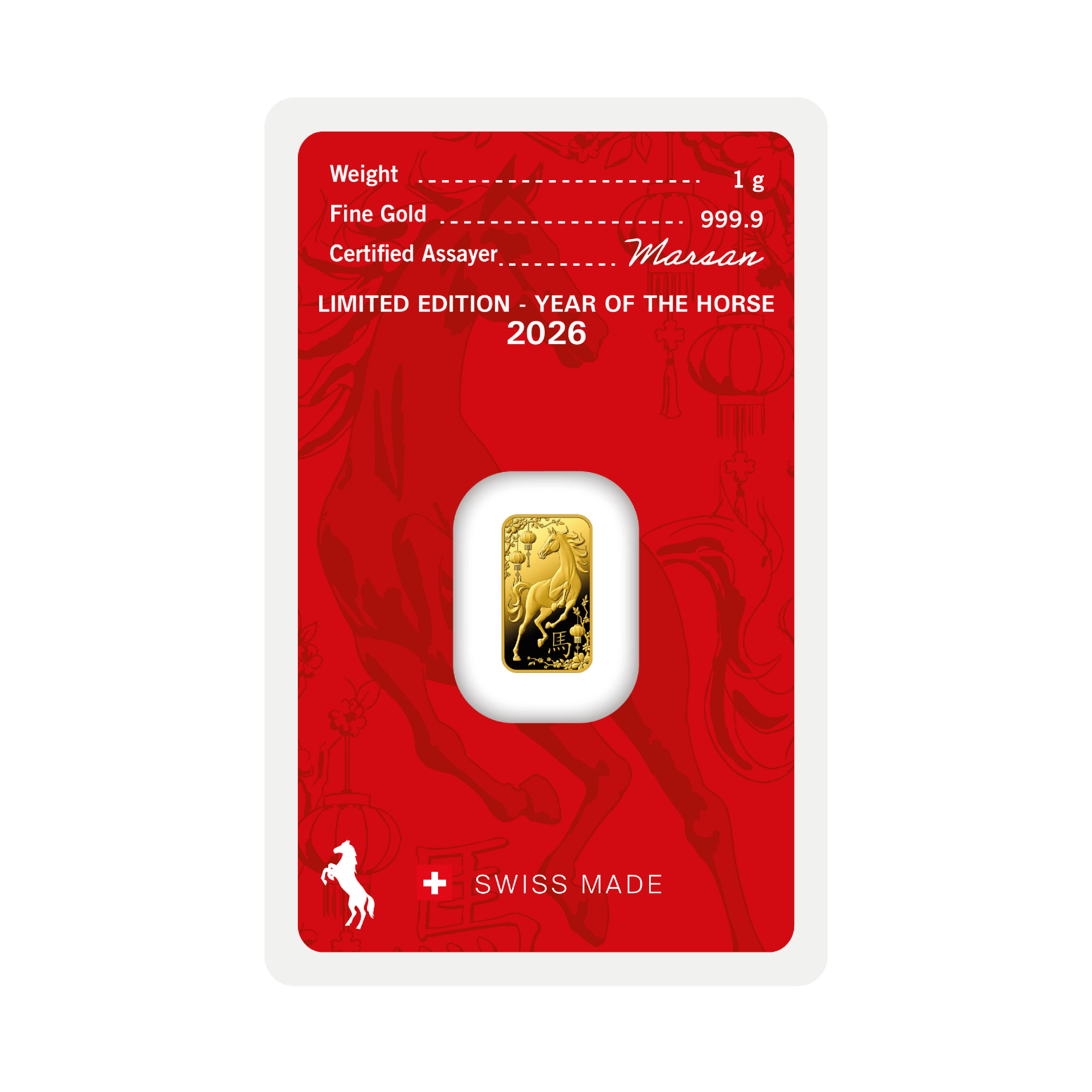 In 2026, we celebrate the Year of the Horse, a sign revered for its strength, independence, and passion. The Year of the Horse Gold Bar by Argor-Heraeus captures this spirit with a majestic horse in motion, surrounded by motifs that symbolize celebration and renewal.